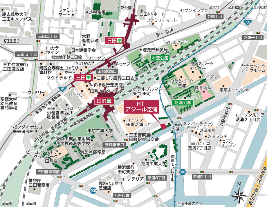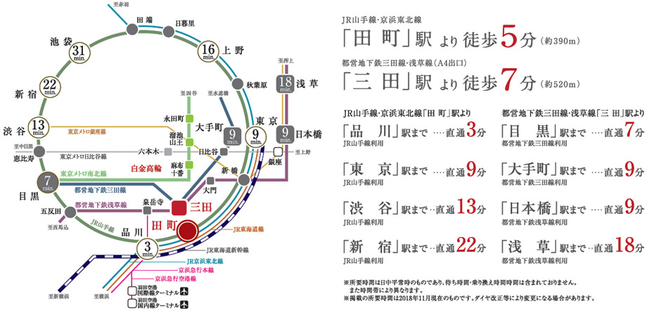 ※徒歩所用分数は地図上の計測距離を80mを1分で換算したもので、端数は切り上げています。